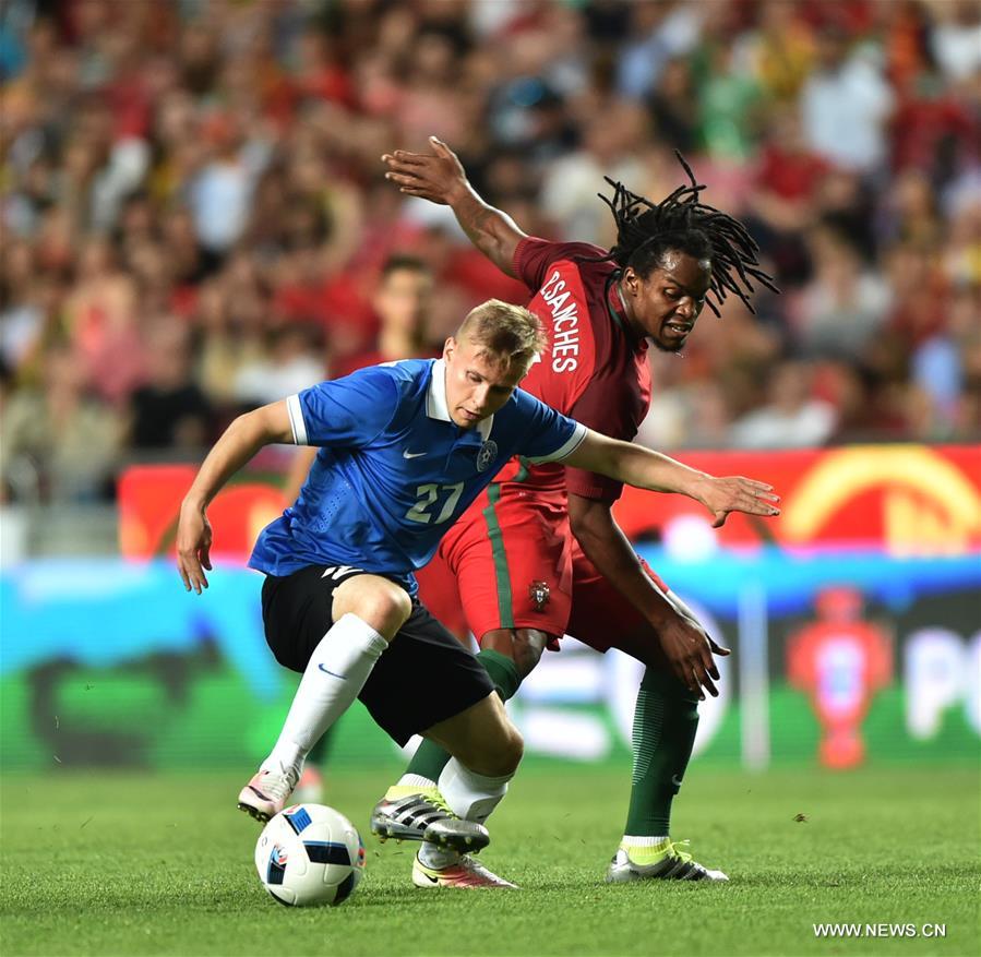 LISBON, June 9, 2016 (Xinhua) -- Portugal's Renato Sanches (R) vies with Estonia's Abdreas Raudsepp during a friendly soccer match in preparation for UEFA Euro 2016 Championship at Luz Stadium in Lisbon, Portugal, June 8, 2016. Portugal won 7-0. (Xinhua/Zhang Liyun)