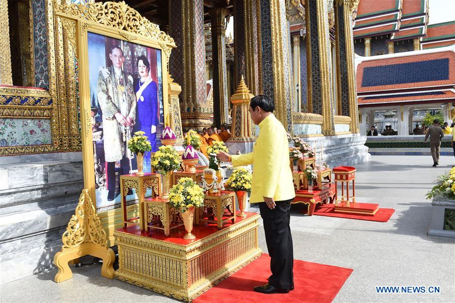 BANGKOK, June 9, 2016 (Xinhua) -- Thai Prime Minister Prayuth Chan-ocha pays tribute to an image of Thai King Bhumibol Adulyadej and Queen Sirikit at the Grand Palace during the 70th anniversary celebrations of Thai King Bhumibol Adulyadej's accession to the throne in Bangkok, Thailand, June 9, 2016. The Thai king took the throne on June 9, 1946, when he was only 19. He is now the world's longest-serving monarch. (Xinhua/Rachen Sageamsak)