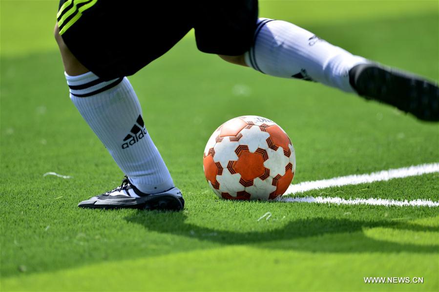 ENSHI, June 13, 2016 (Xinhua) -- A player competes during a local juvenile football league in Enshi Tujia and Miao Autonomous Prefecture, central China's Hubei Province, June 13, 2016. The government of Enshi, which is located in the western mountainous area of Hubei, has made lots of efforts in promoting football game among juveniles in recent years. (Xinhua/Song Wen)