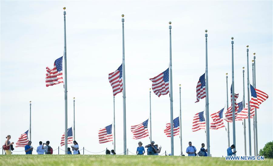 WASHINGTON D.C., June 13, 2016 (Xinhua) -- The U.S. national flag flies at half-mast at the Washington Monument to mourn the victims of the mass shooting at a nightclub in Orlando, in Washington D.C., the United States, June 13, 2016. (Xinhua/Bao Dandan)