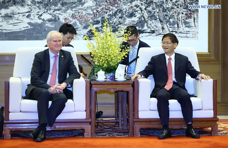 BEIJING, June 14, 2016 (Xinhua) -- Meng Jianzhu (R, front), head of the Commission for Political and Legal Affairs of the Communist Party of China Central Committee, meets with a British delegation, led by Mark Lyall Grant, National Security Advisor to British Prime Minister, attending the first China-Britain high-level security dialogue in Beijing, capital of China, June 13, 2016. (Xinhua/Ding Haitao)