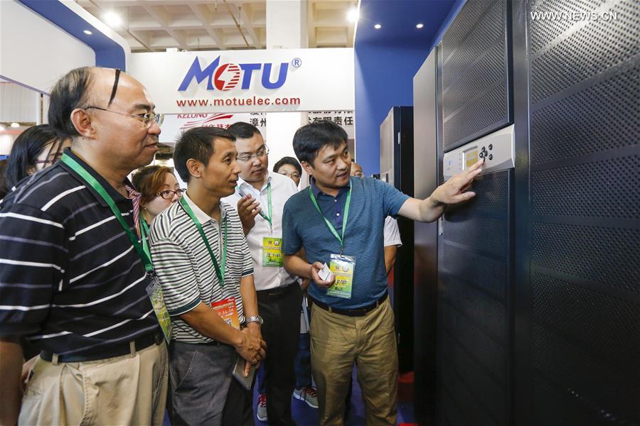 BEIJING, June 15, 2016 (Xinhua) -- A company representative shows a Uninterruptible Power System (UPS) product at Chinese Defense Information Equipment & Technology Exhibition 2016 (CNTE2016) in Beijing, capital of China, June 15, 2016. This year's CNTE kicked off at China International Exhibition Center on Wednesday. (Xinhua/Shen Bohan)