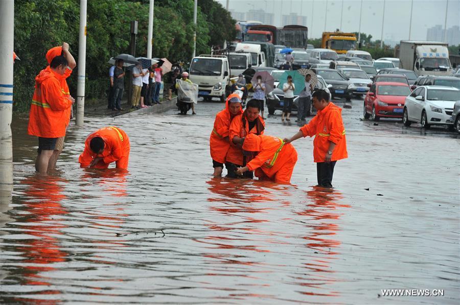 ZHUZHOU, June 15, 2016 (Xinhua) -- Workers clear drains to discharge flood water after a heavy rainfall in Zhuzhou City, central China's Hunan Province, June 15, 2016. (Xinhua/Long Hongtao)