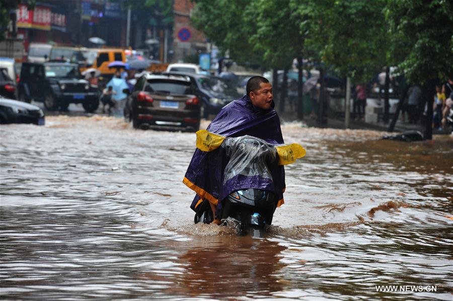 ZHUZHOU, June 15, 2016 (Xinhua) -- A man rides on a waterlogged road after a heavy rainfall in Zhuzhou City, central China's Hunan Province, June 15, 2016. (Xinhua/Long Hongtao)