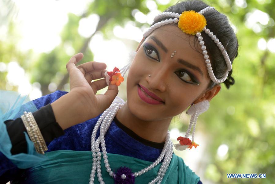 DHAKA, June 15, 2016 (Xinhua) -- An artist poses for a photo during an event marking Pahela Ashar, the first day of the rainy season, in Dhaka, Bangladesh, June 15, 2016. (Xinhua/Shariful Islam)