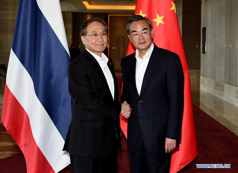 YUXI, June 15, 2016 (Xinhua) -- Chinese Foreign Minister Wang Yi (R) meets with Thai Foreign Minister Don Pramudwinai, who was here to attend a special China-ASEAN foreign ministers' meeting, in Yuxi, southwest China's Yunnan Province, June 14, 2016. (Xinhua/Lin Yiguang)