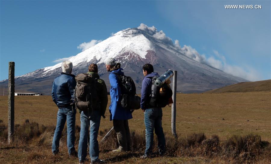 COTOPAXI, June 15, 2016 (Xinhua) -- Image taken on Aug. 18, 2015 shows people watching the Cotopaxi volcano in El Chasqui, Cotopaxi Province, Ecuador. Ecuador's National Assembly approved on Tuesday a bilateral agreement with China, allowing the nationals of the two countries to visit the other country with no visas. (Xinhua/Santiago Armas)