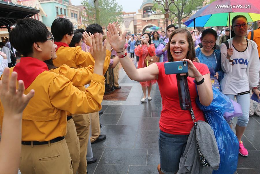 SHANGHAI, June 16, 2016 (Xinhua) -- Tourists are welcomed in newly-opened Shanghai Disney Resort in Shanghai, east China, June 16, 2016. The Shanghai Disney Resort, with a unique blend of Disney magic and Chinese culture, officially opened Thursday. It's the first Disney resort destination on the Chinese mainland and the sixth around the world. (Xinhua/Pei Xin)