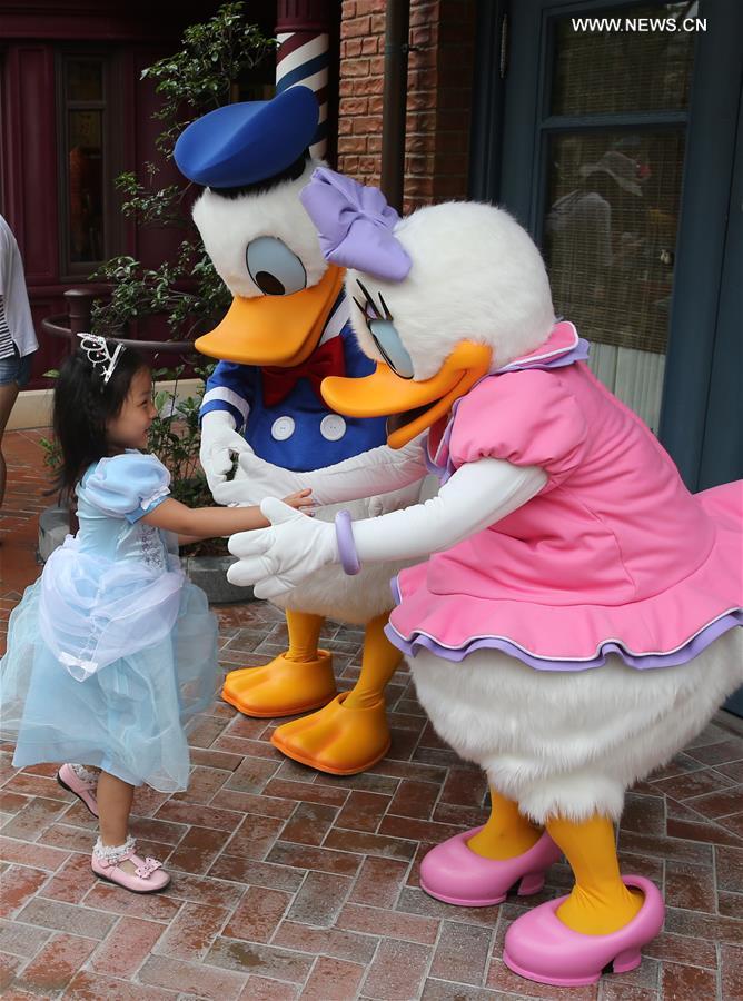 SHANGHAI, June 16, 2016 (Xinhua) -- A girl shakes hands with Donald Duck and Daisy Duck in newly-opened Shanghai Disney Resort in Shanghai, east China, June 16, 2016. The Shanghai Disney Resort, with a unique blend of Disney magic and Chinese culture, officially opened Thursday. It's the first Disney resort destination on the Chinese mainland and the sixth around the world. (Xinhua/Pei Xin)