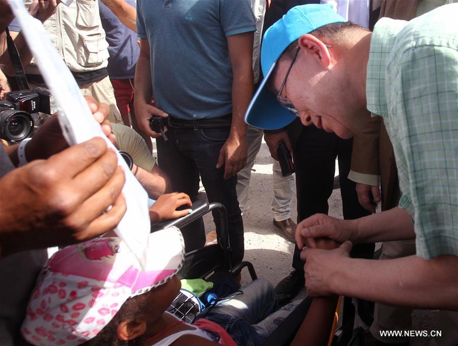 LESVOS, June 18, 2016 (Xinhua) -- UN Secretary General Ban Ki-moon (R) visits a refugees' reception center on Lesvos island, Greece on June 18, 2016. UN Secretary General Ban Ki-moon praised Greece's response to the ongoing refugee crisis during a visit to Athens on Saturday and urged the international community to provide more supports to the thousands of people fleeing conflicts. (Xinhua/Marios Lolos)
