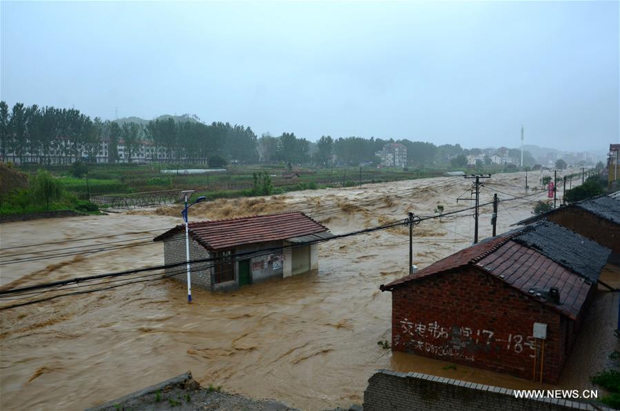 WUHAN, June 19, 2016 (Xinhua) -- Torrential flood of Baijian River hits Lianhua Village of Wenquan Township in Yingshan County, central China's Hubei Province, June 19, 2016. Rainstorm has swept 21 counties in Hubei since Saturday, leaving four people dead and 12 missing, according to the provincial civil affairs department. It toppled or damaged more than 1,100 rooms and affected 58,320 hectares of farmland, inflicting direct economic losses worth 620 million yuan (94 million U.S. dollars). (Xinhua)
