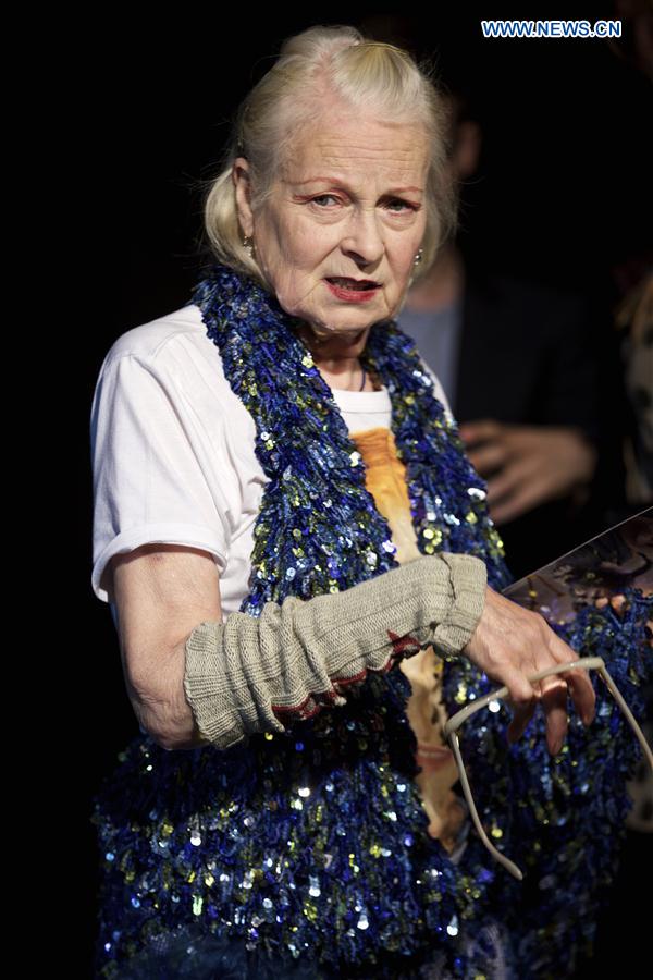 MILAN, June 20, 2016 (Xinhua) -- British designer Vivienne Westwood poses for a photo backstage before Vivienne Westwood men's Spring-Summer 2016-2017 collection, part of the Milan Fashion Week in Milan, Italy, on June 19, 2016. (Xinhua/Jin Yu)