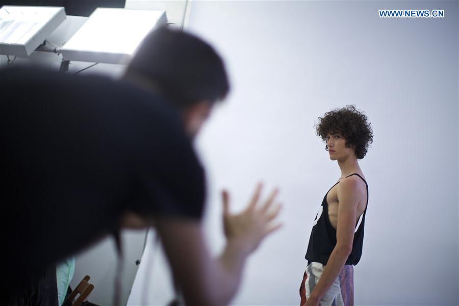 MILAN, June 20, 2016 (Xinhua) -- A model poses for a photo backstage before Vivienne Westwood men's Spring-Summer 2016-2017 collection, part of the Milan Fashion Week in Milan, Italy, on June 19, 2016. (Xinhua/Jin Yu)