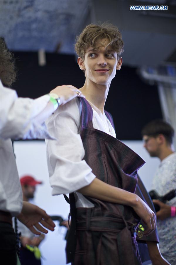 MILAN, June 20, 2016 (Xinhua) -- A model gets changed backstage before Vivienne Westwood men's Spring-Summer 2016-2017 collection, part of the Milan Fashion Week in Milan, Italy, on June 19, 2016. (Xinhua/Jin Yu)