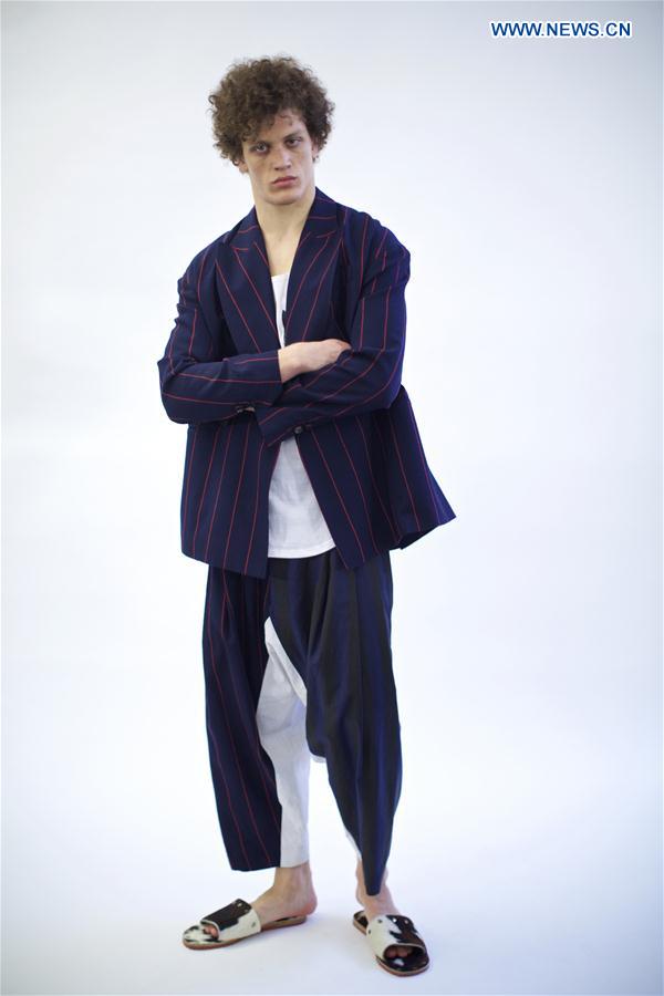 MILAN, June 20, 2016 (Xinhua) -- A model poses for a photo backstage before Vivienne Westwood men's Spring-Summer 2016-2017 collection, part of the Milan Fashion Week in Milan, Italy, on June 19, 2016. (Xinhua/Jin Yu)