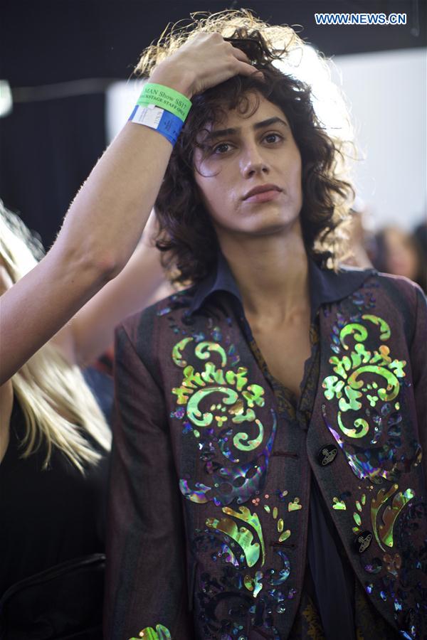 MILAN, June 20, 2016 (Xinhua) -- A model has his hair made backstage before Vivienne Westwood men's Spring-Summer 2016-2017 collection, part of the Milan Fashion Week in Milan, Italy, on June 19, 2016. (Xinhua/Jin Yu)
