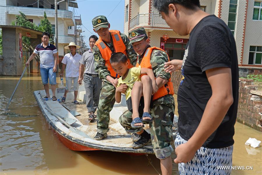 SHANGRAO, June 21, 2016 (Xinhua) -- Firefighters transfer a sick child in Xiongjia Village of Guxiandu Township in Poyang County, east China's Jiangxi Province, June 21, 2016. A flood peak of Changjiang River made an 100-meter-wide breach in Guxiandu Monday evening. About 5,600 people and more than 667 hectares of farmlands were affected. (Xinhua/Wan Xiang)