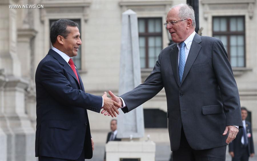LIMA, June 23, 2016 (Xinhua) -- Peru's outgoing President Ollanta Humala (L) shakes hands with President-elect Pedro Pablo Kuczynski before a meeting at the Government Palace in Lima, Peru, on June 22, 2016. (Xinhua/Oscar Farje Gomero/ANDINA)