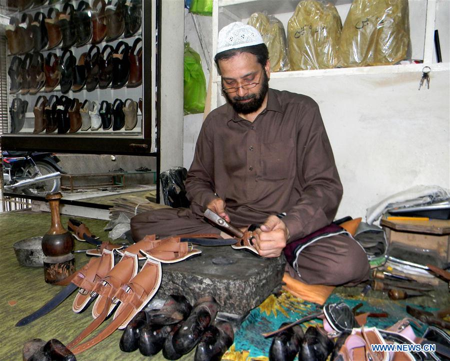PESHAWAR, June 29, 2016 (Xinhua) -- A worker makes traditional shoes "chapli" for the upcoming Eid al-Fitr festival in Peshawar, northwest Pakistan, on June 29, 2016. People in northwest region of Pakistan wear traditional "chapli" on important occasions like Eid al-Fitr. (Xinhua/Ahmad Sidique)