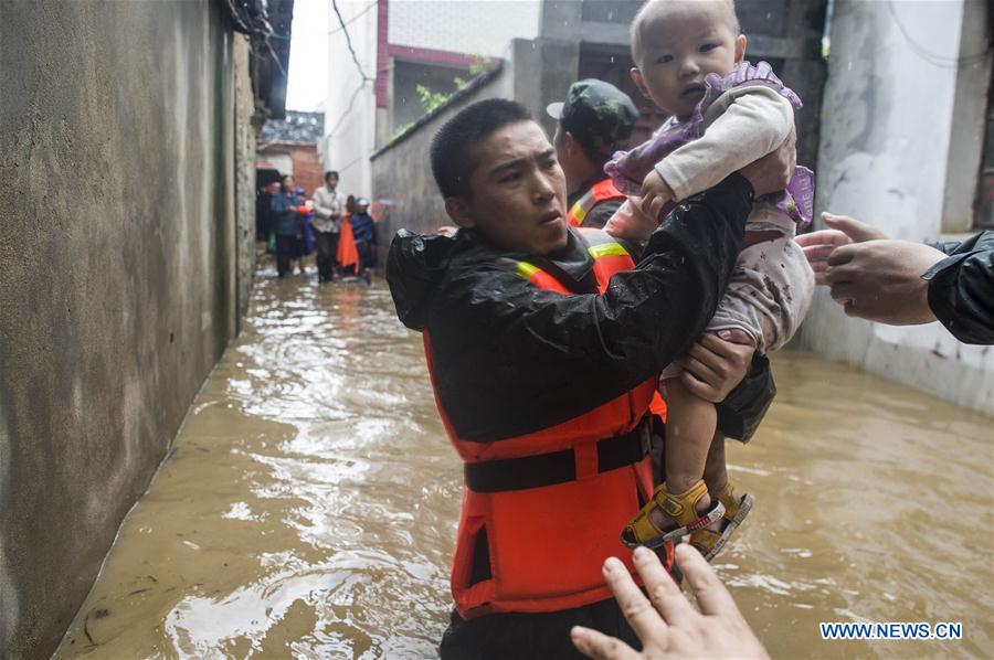 WUHAN, July 2, 2016 (Xinhua) -- Rescuers evacuate a kid after a dike breach in Xinzhou District of Wuhan, central China's Hubei Province, July 2, 2016. Heavy rainfall caused a dike breach on the Jushui River in Xinzhou District of Wuhan Friday. More than 700 rescuers were sent there to evacuate stranded villagers. (Xinhua/Xiao Yijiu)