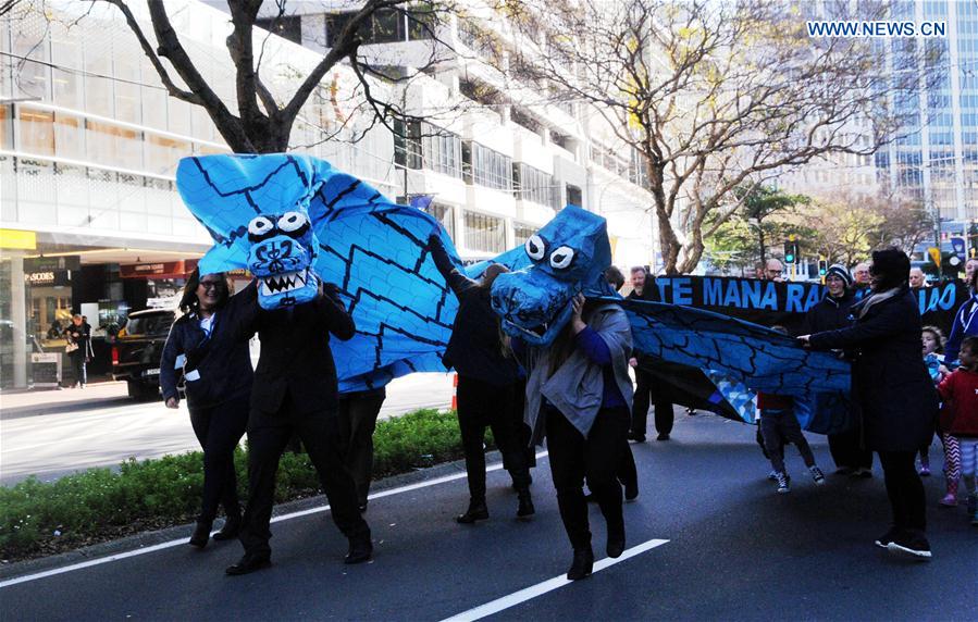 WELLINGTON, July 4, 2016 (Xinhua) -- People carry models of dragons during a parade celebrating the Maori Language Week in Wellington, New Zealand, on July 4, 2016. Te Reo Maori (the Maori language) fever has hit the streets of New Zealand's capital with thousands of people turning up in celebration of the Maori Language Week from July 4 to July 10. (Xinhua/Su Liang)