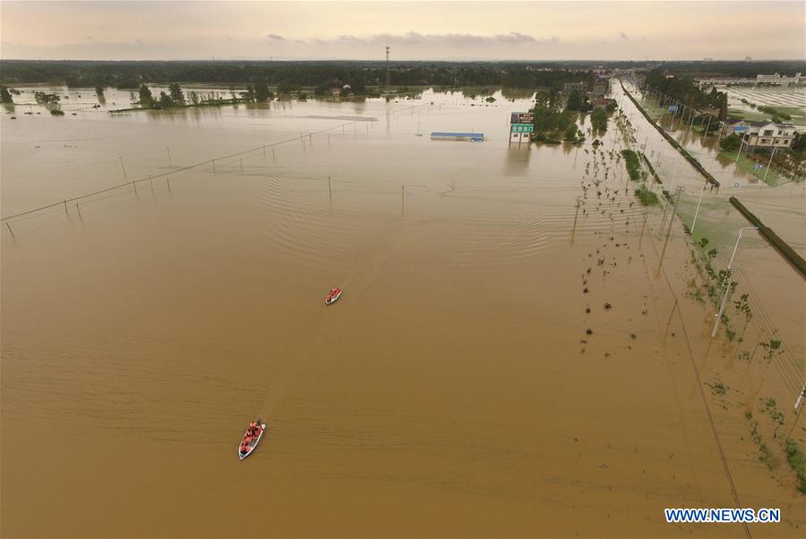 HEFEI, July 5, 2016 (Xinhua) -- Rescuers work on dinghies in flooded Shucheng County, east China's Anhui Province, July 3, 2016. Rainstorm has battered Shucheng County since June 30, ripping a breach on a dyke of the Fengle River on July 2. More than 10,000 villagers have been tranferred to safe places overnight. (Xinhua/Xiang Chunlei)