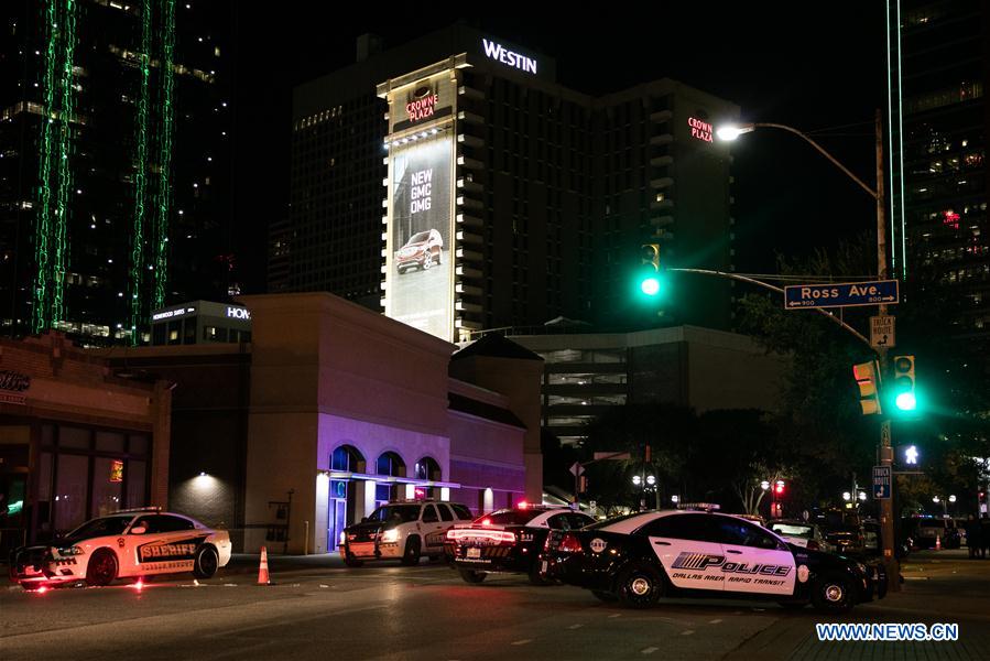DALLAS, July 8, 2016 (Xinhua) -- Police cars gather around the El Centro College parking garage following the sniper shooting in downtown Dallas, the United States, July 7, 2016. Snipers opened fire on police officers in Dallas, killing at least 4 police officers. (Xinhua/Tian Dan)