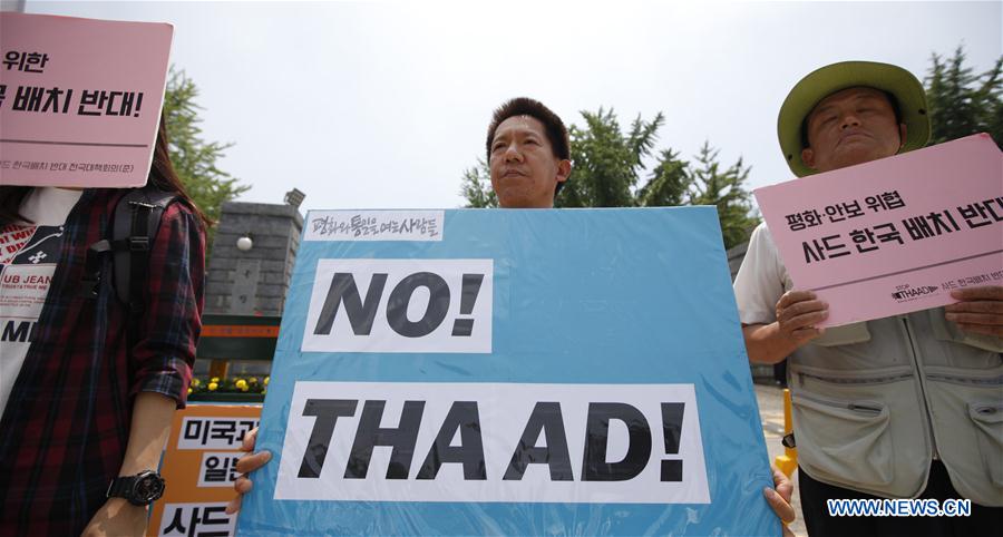 SEOUL, July 8, 2016 (Xinhua) -- Local residents take part in a protest against the decision to deploy the Terminal High Altitude Area Defense (THAAD), in Seoul, South Korea, July 8, 2016. South Korea and the United States on Friday announced their final decision to deploy the THAAD in the U.S. Forces Korea (USFK) despite continued oppositions from neighboring countries. (Xinhua/Yao Qilin)