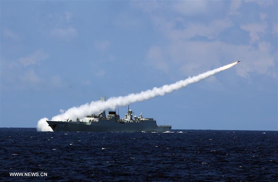 SANYA, July 9, 2016 (Xinhua) -- Missile destroyer Guangzhou launches an air-defense missile during a military exercise in the water area near south China's Hainan Island and Xisha islands, July 8, 2016. Chinese navy conducted an annual combat drill in the water area near south China's Hainan Island and Xisha islands on Friday. (Xinhua/Zha Chunming)