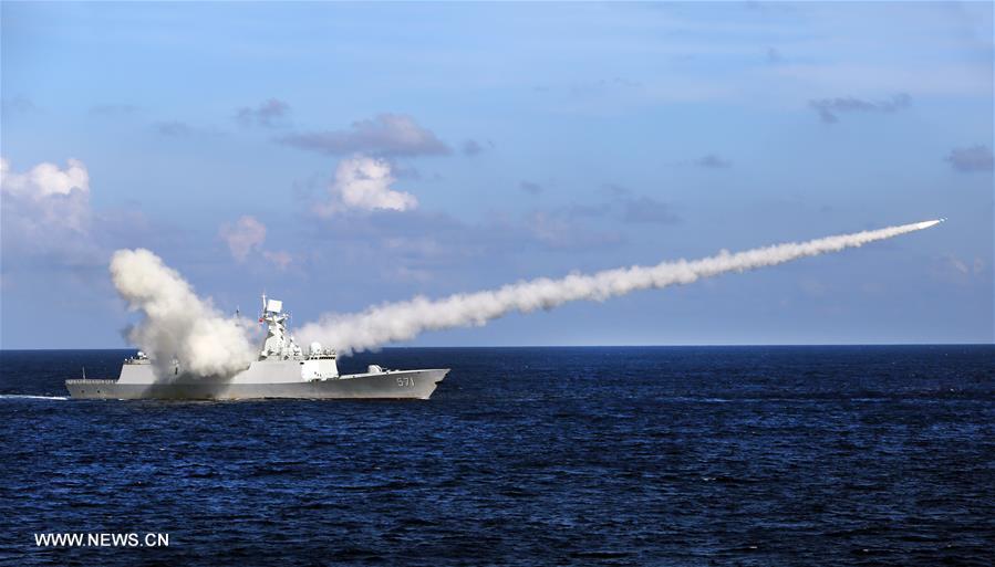 SANYA, July 9, 2016 (Xinhua) -- Missile frigate Yuncheng launches an anti-ship missile during a military exercise in the water area near south China's Hainan Island and Xisha islands, July 8, 2016. Chinese navy conducted an annual combat drill in the water area near south China's Hainan Island and Xisha islands on Friday. (Xinhua/Zha Chunming)