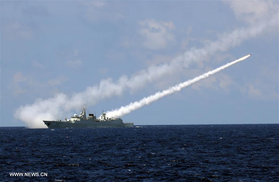 SANYA, July 9, 2016 (Xinhua) -- Missile destroyer Guangzhou launches an air-defense missile during a military exercise in the water area near south China's Hainan Island and Xisha islands, July 8, 2016. Chinese navy conducted an annual combat drill in the water area near south China's Hainan Island and Xisha islands on Friday. (Xinhua/Zha Chunming)