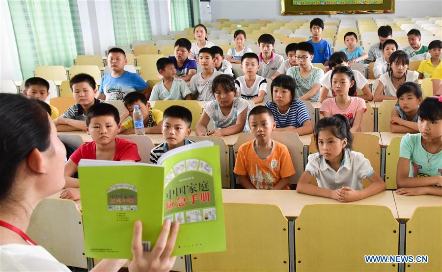 SHUCHENG, July 9, 2016 (Xinhua) -- College student volunteer Bao Juan teaches children about post-disaster health care and control knowledge at a makeshift site in Shucheng County, east China's Anhui Province, July 9, 2016. More than 6,000 local residents were relocated to makeshift settlement sites after breakdown of dykes on July 2 due to torrential rainfall. (Xinhua/Zhang Xiangyang)