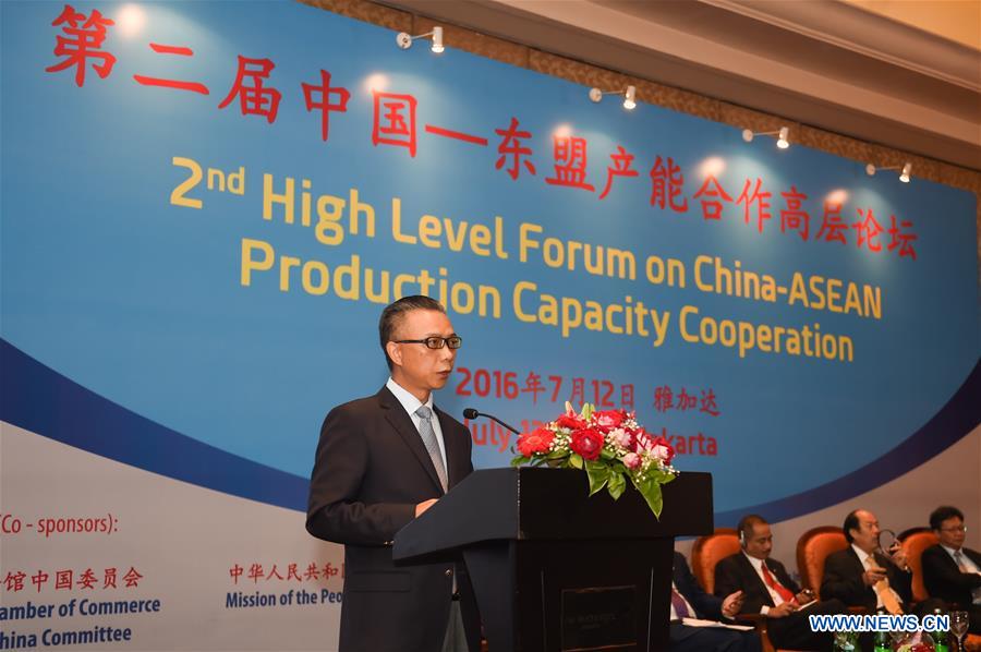 JAKARTA, July 13, 2016 (Xinhua) -- Chinese Ambassador to the Association of Southeast Asian Nations (ASEAN) Xu Bu addresses the 2nd High Level Forum on China-ASEAN Production Capacity Cooperation in Jakarta, Indonesia, July 12, 2016. (Xinhua/Du Yu)