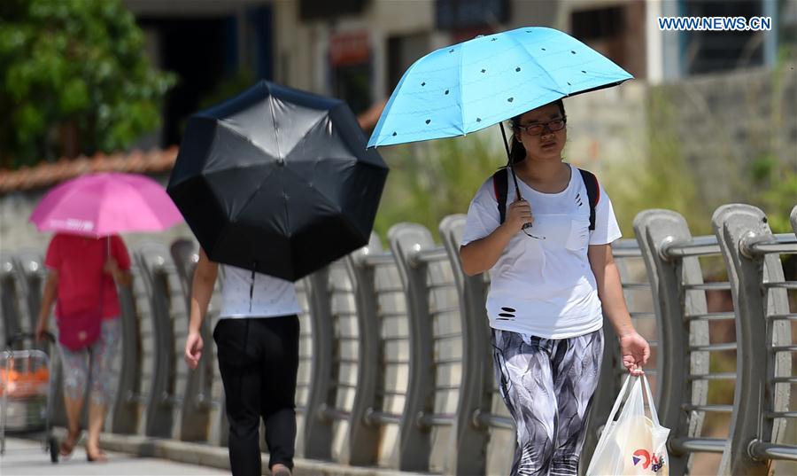 NANNING, July 17, 2016 (Xinhua) -- Citizens take shelter from the blazing sun with umbrellas in Nanning, capital city of south China's Guangxi Zhuang Autonomous Region, July 17, 2016. The local meteorological authority issued a blue alert for heat Sunday. (Xinhua/Lu Boan)