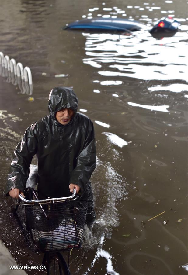TIANJIN, July 20, 2016 (Xinhua) -- A resident wades through a flooded road which submerges a car in Tianjin, north China, July 20, 2016. Tianjin was battered by torrential rain on July 20 and local meteorological bureau has issued a yellow alert for a rainstorm. (Xinhua/Yue Yuewei)