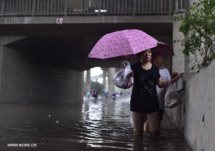 TIANJIN, July 20, 2016 (Xinhua) -- A resident wades through a flooded road in Tianjin, north China, July 20, 2016. Tianjin was battered by torrential rain on July 20 and local meteorological bureau has issued a yellow alert for a rainstorm. (Xinhua/Yue Yuewei)
