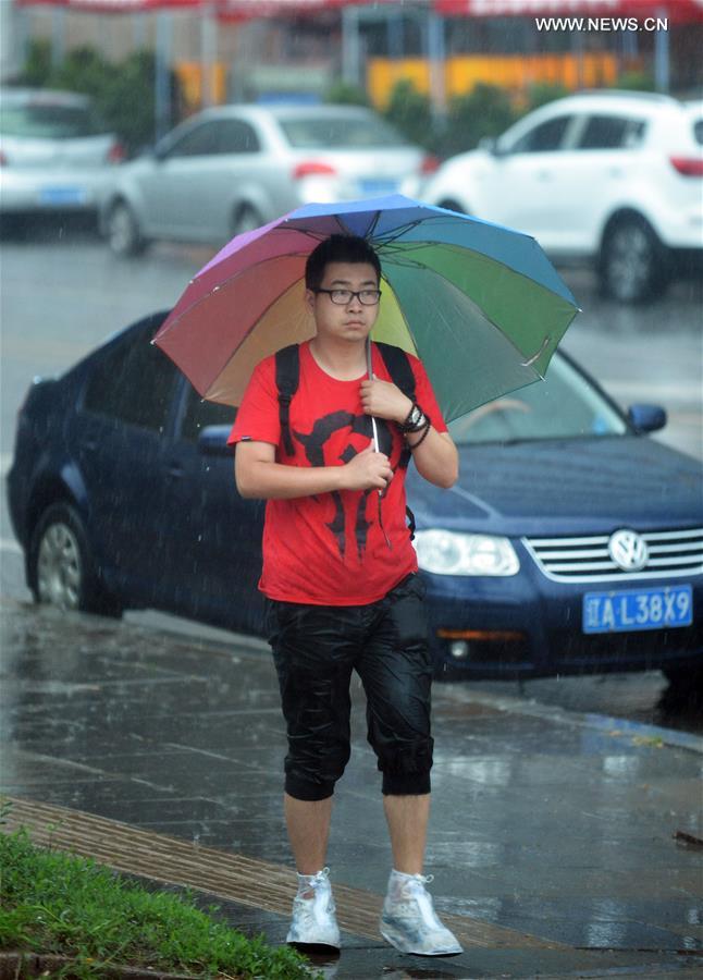 SHENYANG, July 21, 2016 (Xinhua) -- A man walks in rain in Shenyang, capital of northeast China's Liaoning Province, July 21, 2016. Shenyang's meteorological bureau issued an orange alert for rainstorm on Thursday morning. (Xinhua/Long Lei)