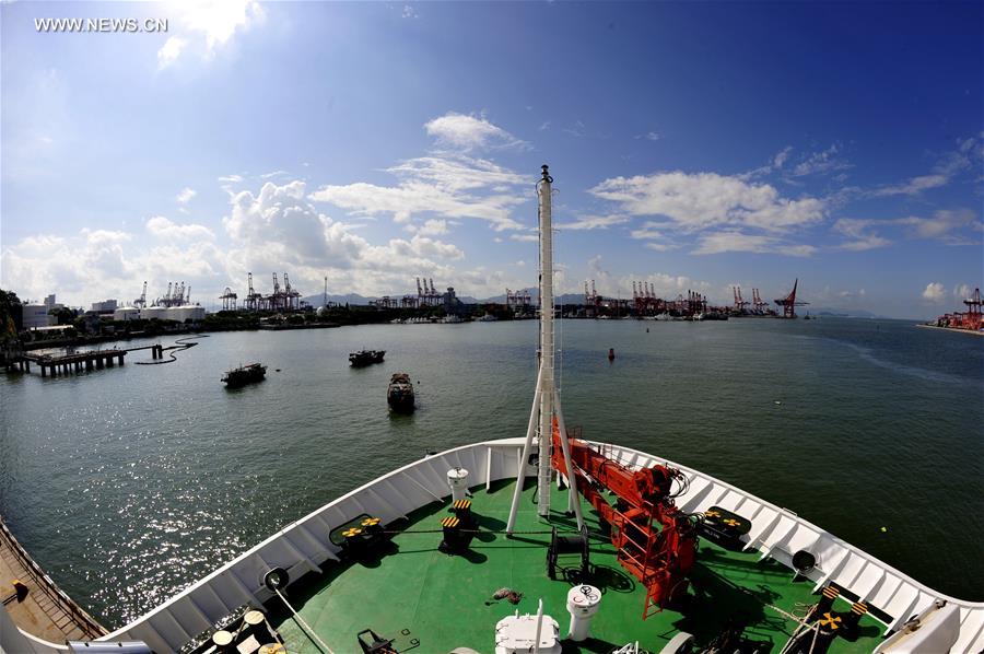ABOARD ZHANG JIAN, July 21, 2016 (Xinhua) -- Photo taken on July 21, 2016 shows the research vessel Zhang Jian carrying "Rainbow Fish," a submersible capable of diving up to 11,000 meters in the sea, at Shenzhen Chiwan Wharf, south China. Chinese research vessel Zhang Jian took a break Thursday in Shenzhen after its exploration in the South China Sea and prepared for exploration in sea waters near Papua New Guinea. (Xinhua/Zhang Jiansong)