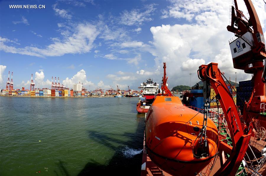 ABOARD ZHANG JIAN, July 21, 2016 (Xinhua) -- Photo taken on July 21, 2016 shows the research vessel Zhang Jian carrying "Rainbow Fish," a submersible capable of diving up to 11,000 meters in the sea, at Shenzhen Chiwan Wharf, south China. Chinese research vessel Zhang Jian took a break Thursday in Shenzhen after its exploration in the South China Sea and prepared for exploration in sea waters near Papua New Guinea. (Xinhua/Zhang Jiansong)