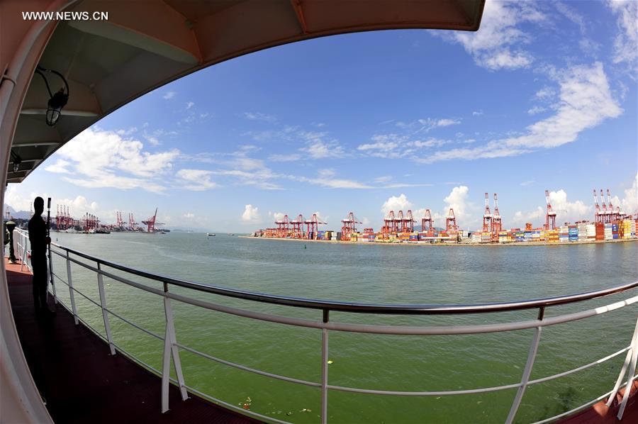 ABOARD ZHANG JIAN, July 21, 2016 (Xinhua) -- Photo taken on July 21, 2016 shows the research vessel Zhang Jian carrying "Rainbow Fish," a submersible capable of diving up to 11,000 meters in the sea, at Shenzhen Chiwan Wharf, south China. Chinese research vessel Zhang Jian took a break Thursday in Shenzhen after its exploration in the South China Sea and prepared for exploration in sea waters near Papua New Guinea. (Xinhua/Zhang Jiansong)