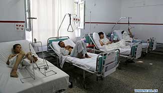 TIANMEN, July 25, 2016 (Xinhua) -- The aerial photo taken on July 25, 2016 shows a view of flooded Huangtan Township in Tianmen, central China's Hubei Province. More than 680,000 people in Tianmen have been affected due to the flood of Hanbei River, a subsidiary of Hanjiang River, since July 18. (Xinhua/Xiong Qi)
