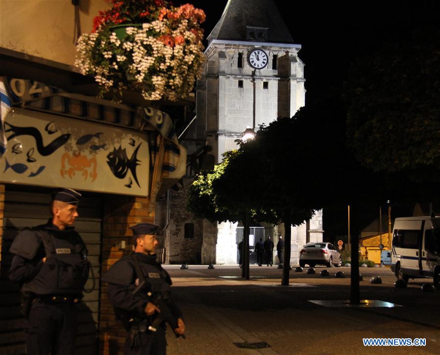 SAINT-ETIENNE-DU-ROUVRAY (FRANCE), July 27, 2016 (Xinhua) -- French police stand guard near the church which was attacked in Saint-Etienne-du-Rouvray, Seine-Maritime department, France, July 26, 2016. Paris Prosecutor Francois Molins on Tuesday said one of the knifemen who slaughtered a priest in a church in northern France was "categorically identified" as Adel kermiche, 19. He was known to intelligence services and tried to join radical insurgents in Syria twice in 2015. (Xinhua/Zhang Xuefei)
