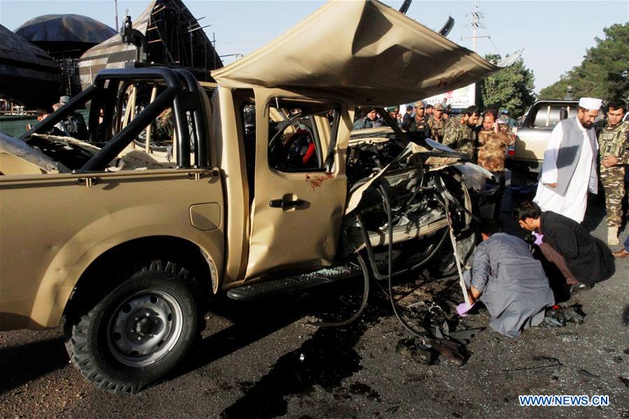 Afghan security force members inspect the site of a blast in Herat province, Afghanistan, Aug. 2, 2016. At least four people including a soldier were injured when a bomb blast targeted a military vehicle in western Herat province of Afghanistan on Tuesday, local officials said. (Xinhua/Nasim Seyamak)