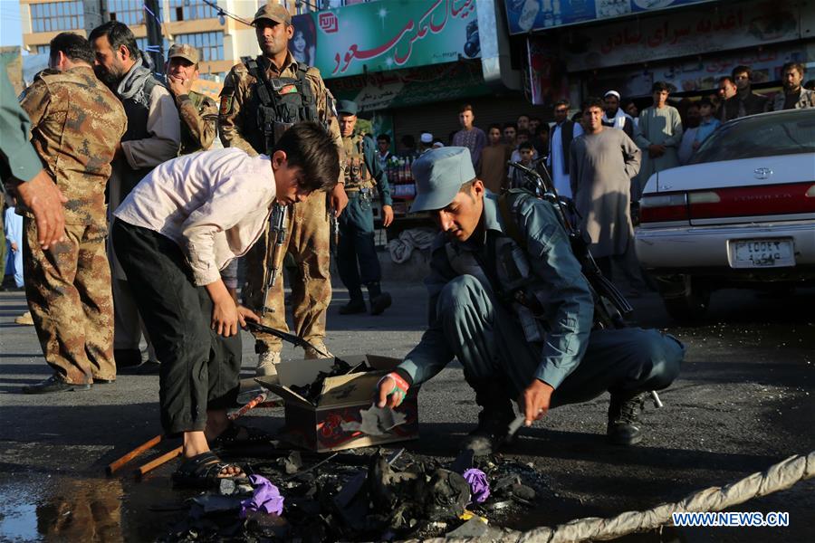 Afghan security force members inspect the site of a blast in Herat province, Afghanistan, Aug. 2, 2016. At least four people including a soldier were injured when a bomb blast targeted a military vehicle in western Herat province of Afghanistan on Tuesday, local officials said. (Xinhua/Nasim Seyamak)