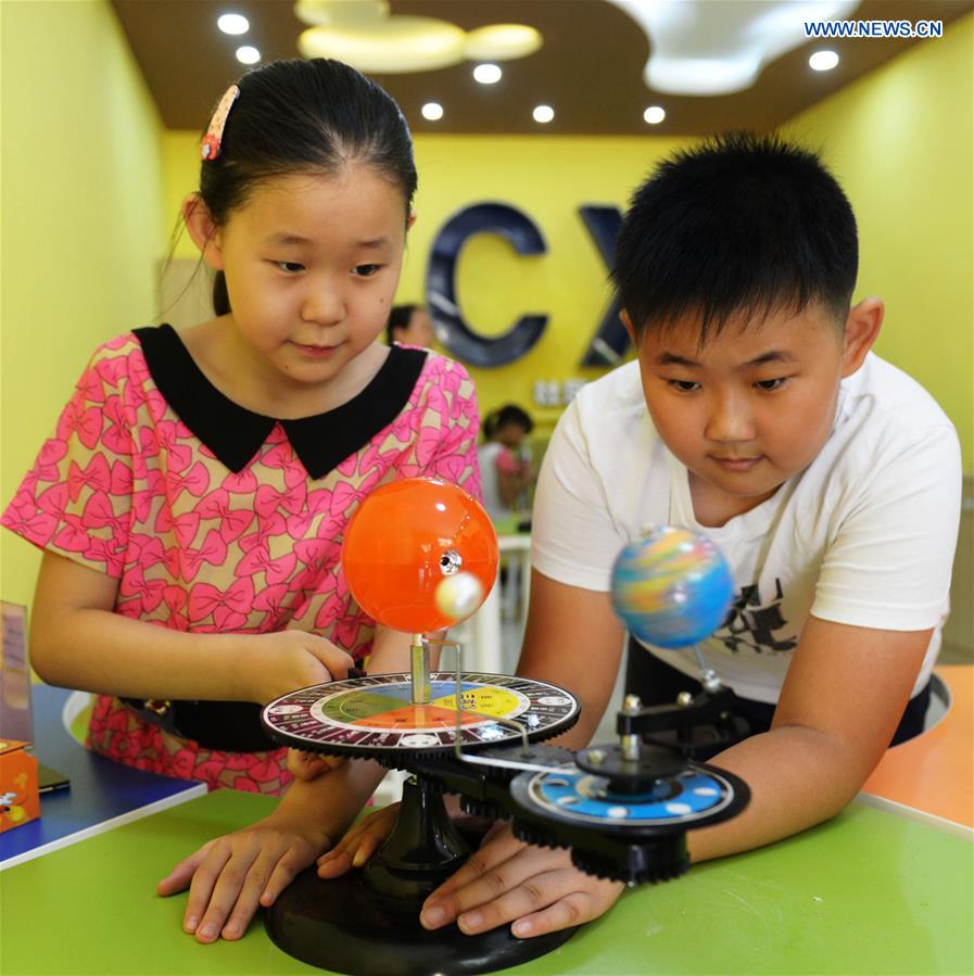 Children visit a science exhibition at a community in Qiaoxi District of Shijiazhuang City, capital of north China's Hebei Province, Aug. 3, 2016. (Xinhua/Wang Xiao)