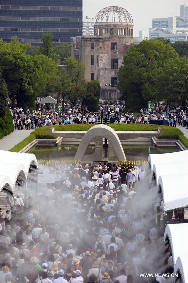 People attend a commemoration to mourn victims of the atomic bombings at the Peace Momorial Park in Hiroshima, Japan, on Aug. 6, 2016. Hiroshima, the city that suffered U.S. atomic bombing in 1945 during World War II, commemorated the 71st anniversary of the bombing on Saturday at the city's Peace Memorial Park. (Xinhua/Ma Ping)