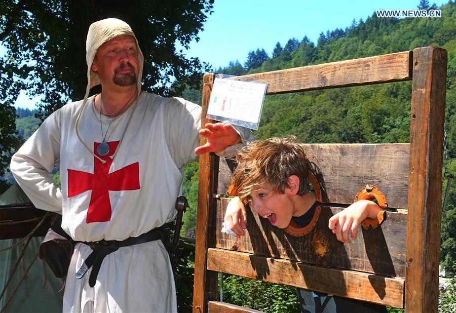 A boy tries out a mock guillotine during the Medieval Festival held in Bouillon, south of Belgium, Aug. 7, 2016. (Xinhua/Gong Bing)
