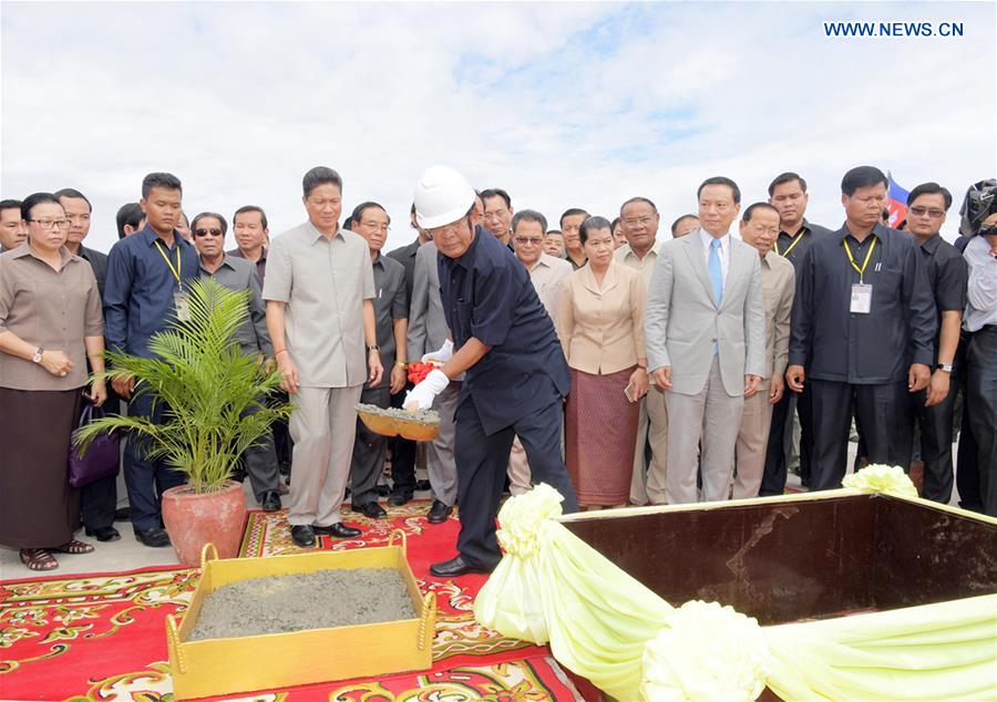 KANDAL (CAMBODIA), Aug. 8, 2016 (Xinhua) -- Cambodian Prime Minister Samdech Techo Hun Sen (C, Front) casts concrete to connect the main span of a Cambodia-China Friendship Bridge in Kandal province, Cambodia, on Aug. 8, 2016. Work on the 7th Cambodia-China Friendship Bridge across Tonle Bassac River here in southern Cambodia is nearing completion after a 28-month construction. (Xinhua/Sovannara)