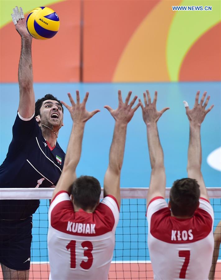 Iran's Shahram Mahmoudi (1st, L) spikes the ball against Poland during a men's preliminary match of volleyball at the 2016 Rio Olympic Games in Rio de Janeiro, Brazil, on Aug. 9, 2016. Poland won 3-2. (Xinhua/Yue Yuewei)