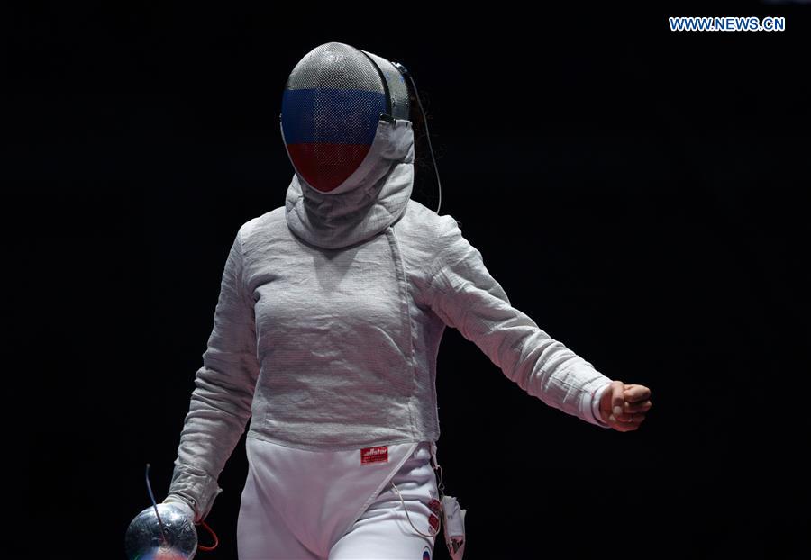 Russia's Yana Egorian reacts during the women's sabre team gold medal match of Fencing against Ukraine at the 2016 Rio Olympic Games in Rio de Janeiro, Brazil, on Aug. 13, 2016. Russia won the gold medal. (Xinhua/Yin Bogu)